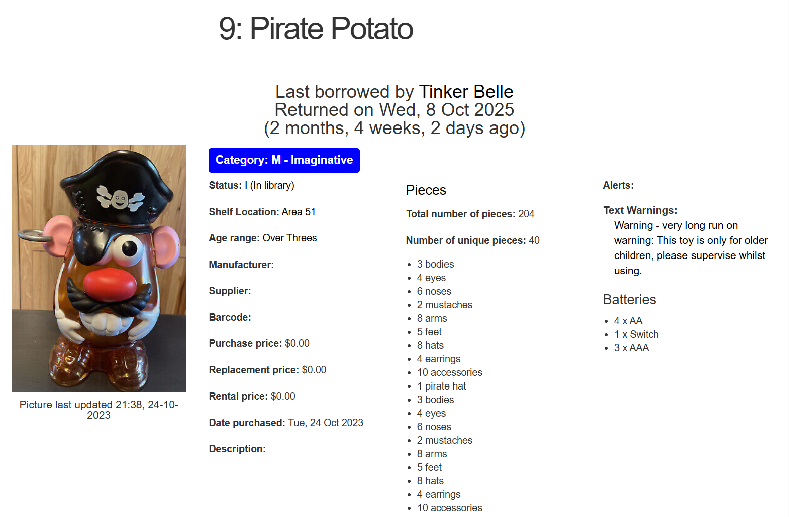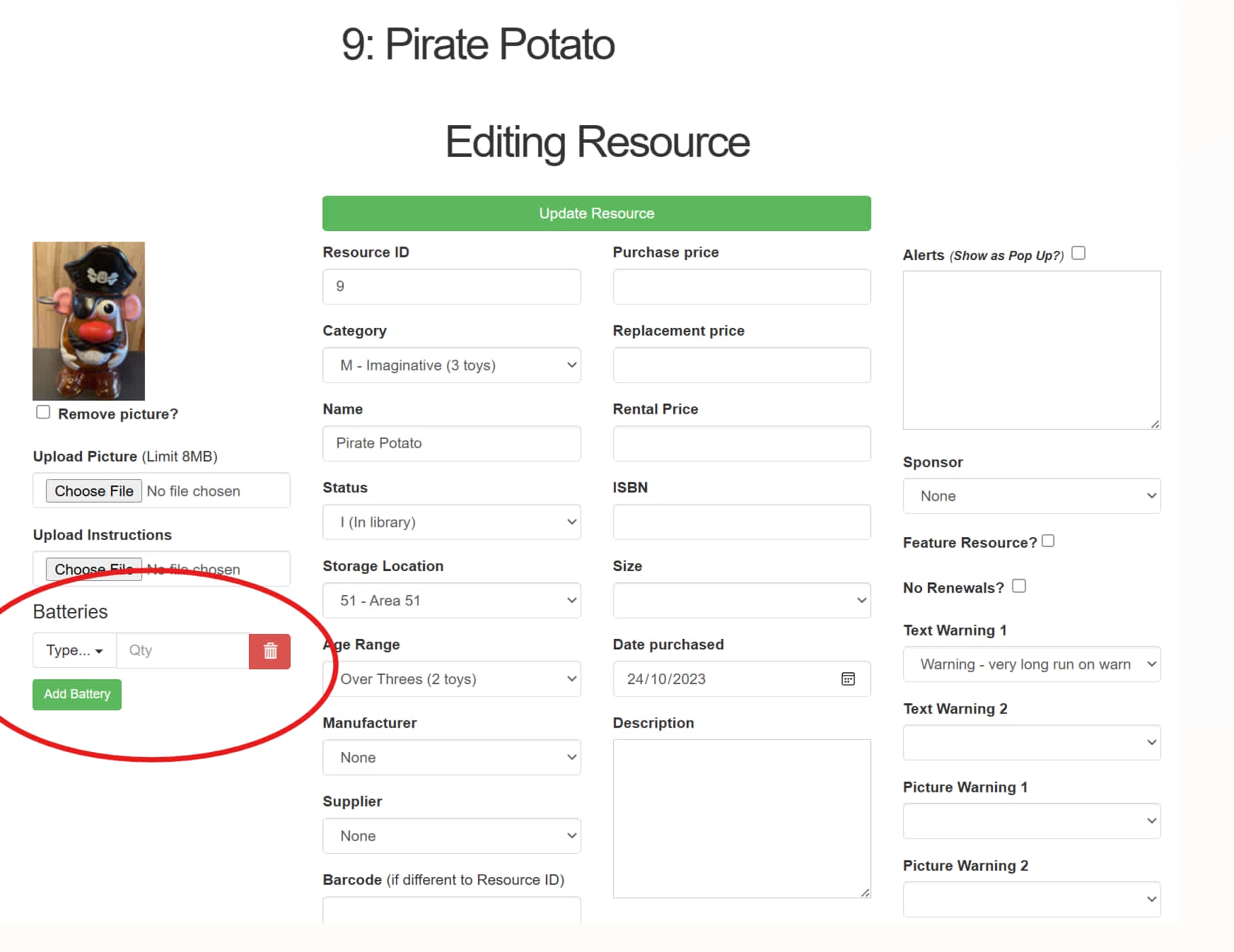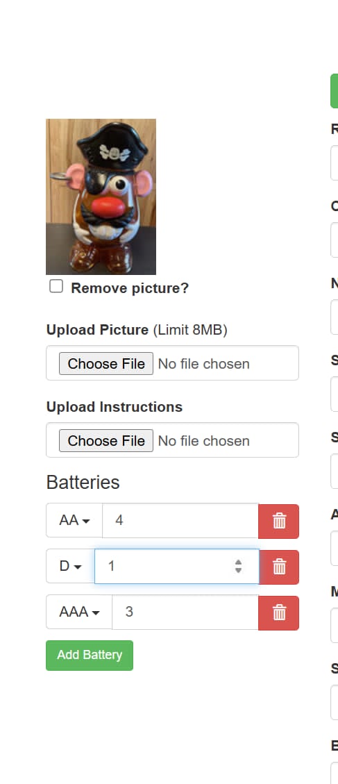 If a toy has any batteries recorded, they will appear on the far right of the toy's page. This information is visible to the public.